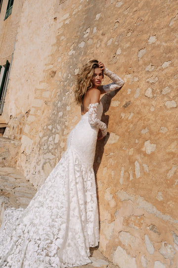 Opaline is a celebration of the woman. This mermaid wedding dress is designed for impact, with an exaggerated fit-and-flare silhouette that snatches every curve.