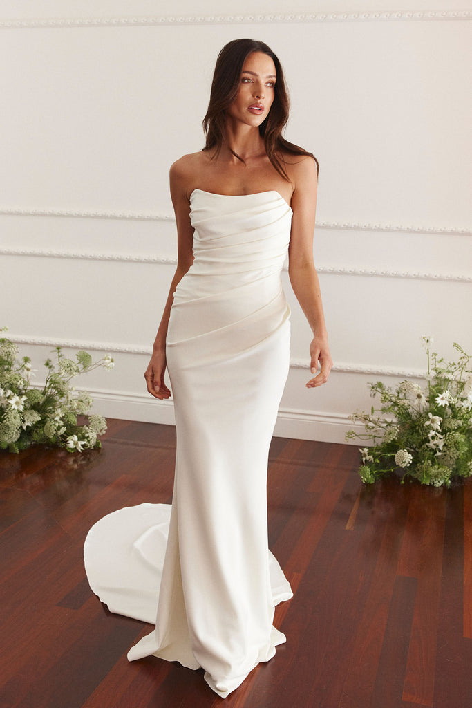 The perfect strapless crepe wedding dress does exist. Phoebe is defined by her simplicity, and she creates the most beautiful silhouette with built-in shapewear and flexible boning, designed to flatter the waist and create a timeless bridal look.