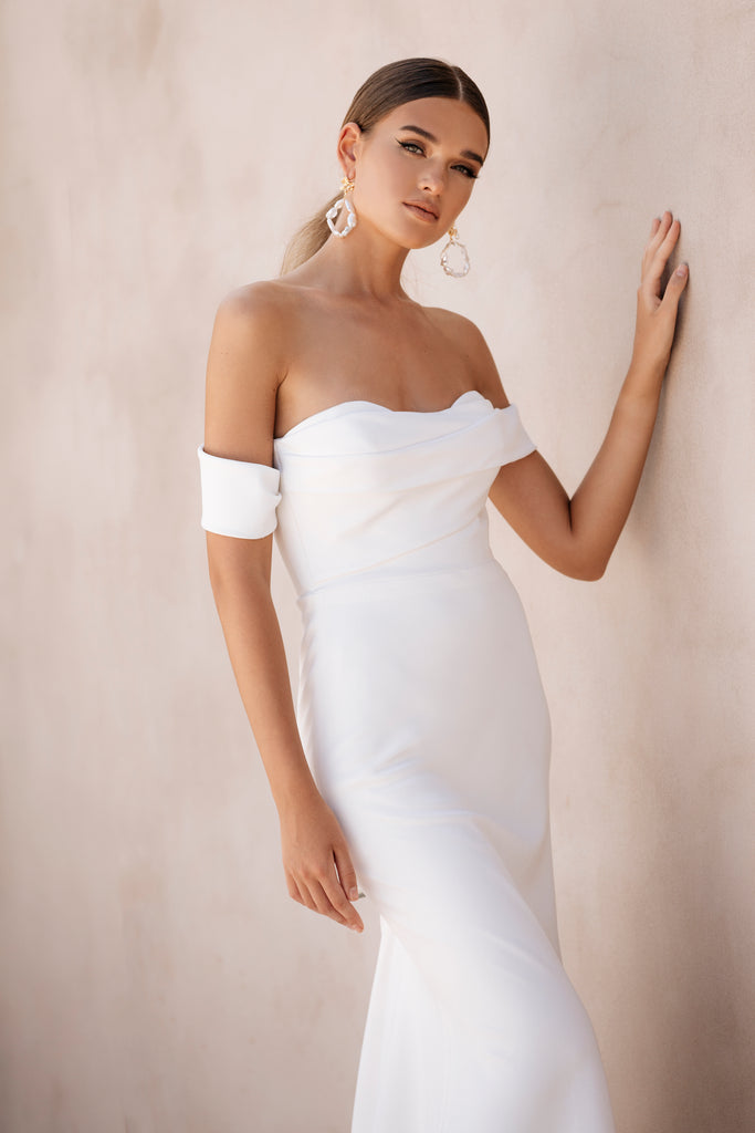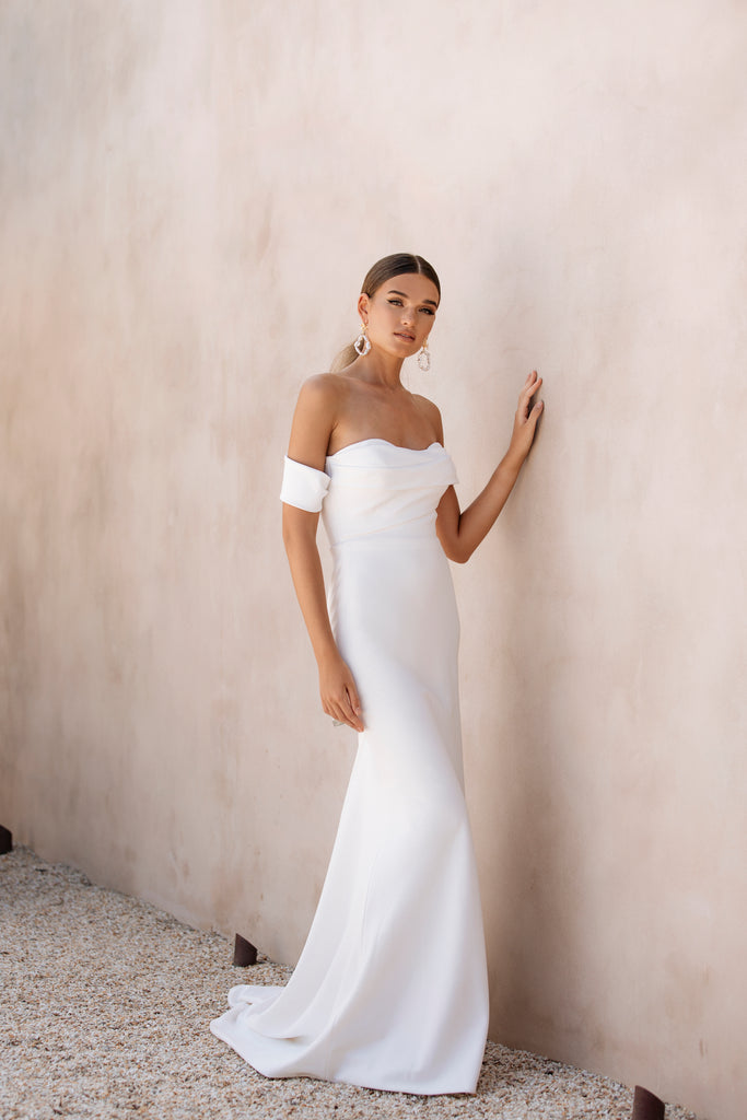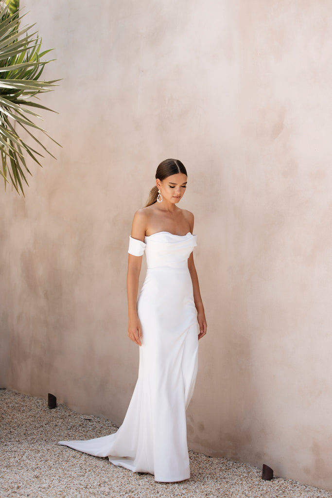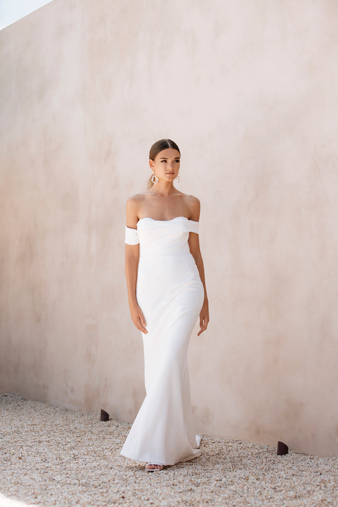 Crepe perfection by Jane Hill. Off the shoulder, covered buttons and a minimalist look.