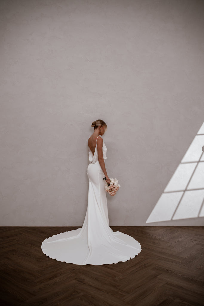 MWL is known for its iconic cowls and Alfie's perfected pattern does not disappoint. Alfie's double, crossed-cowl back is sure to draw the eye. Her flattering boat neck and delicate bodice draping contrasts perfectly with her renowned MWL fitted French crepe skirt, with a godet to hug your curves in all the right places.