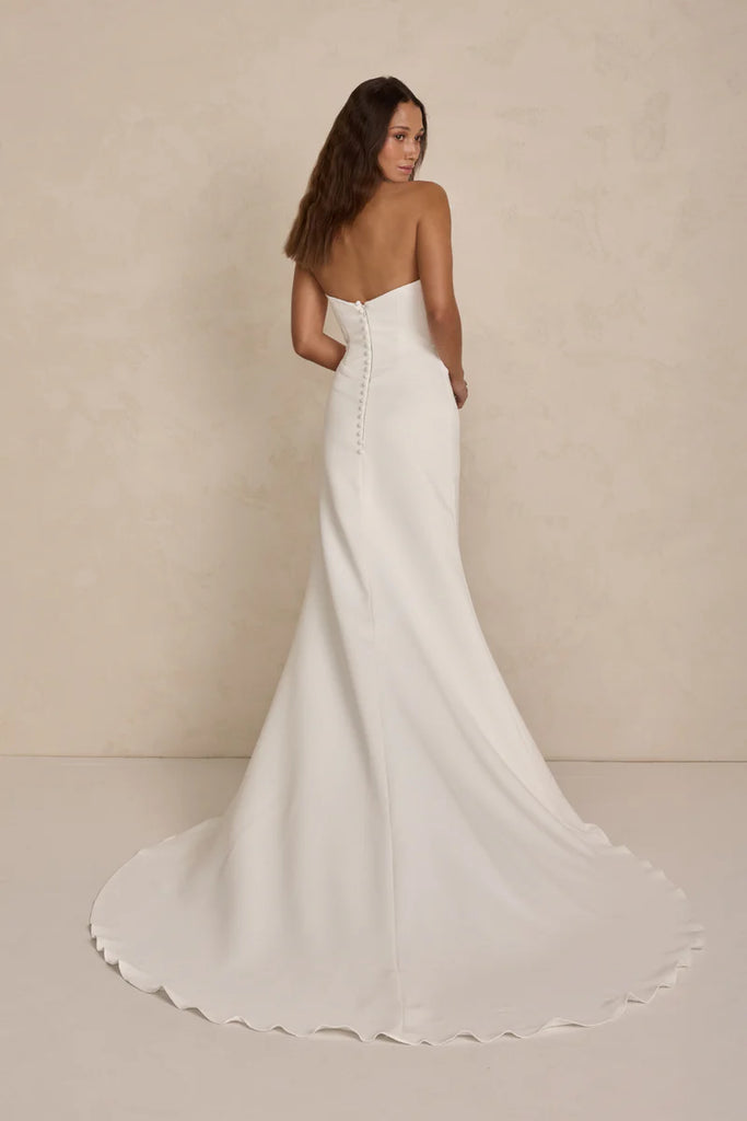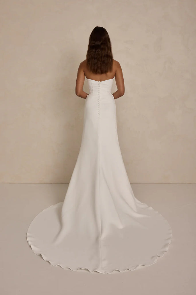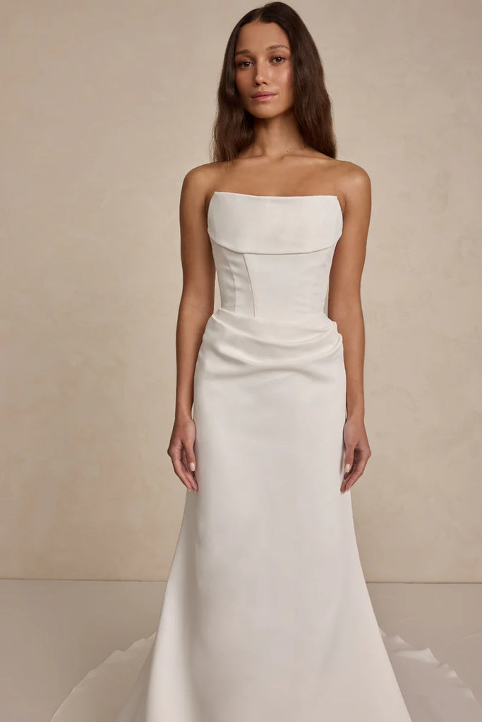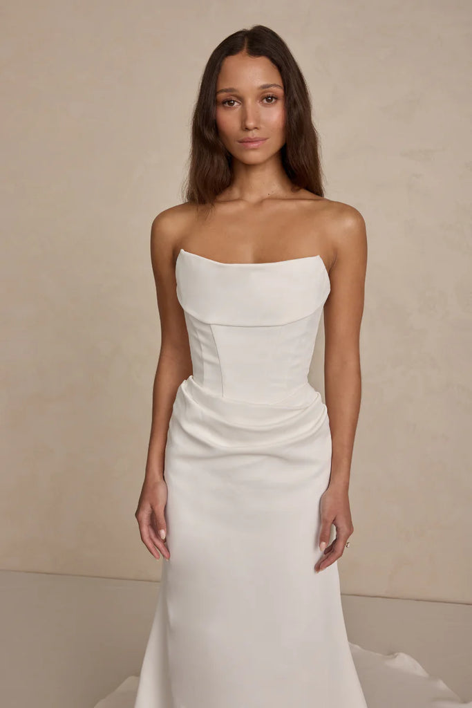 Introducing Knox. Knox is the epitome of quiet luxury. Crafted from our duchess satin, she glows with soft romance. Designed to effortlessly contour to the body, Knox offers gentle structure with natural movement and a subtle drape. She’s made to feel as effortless as she looks. This is timeless bridal, redefined.