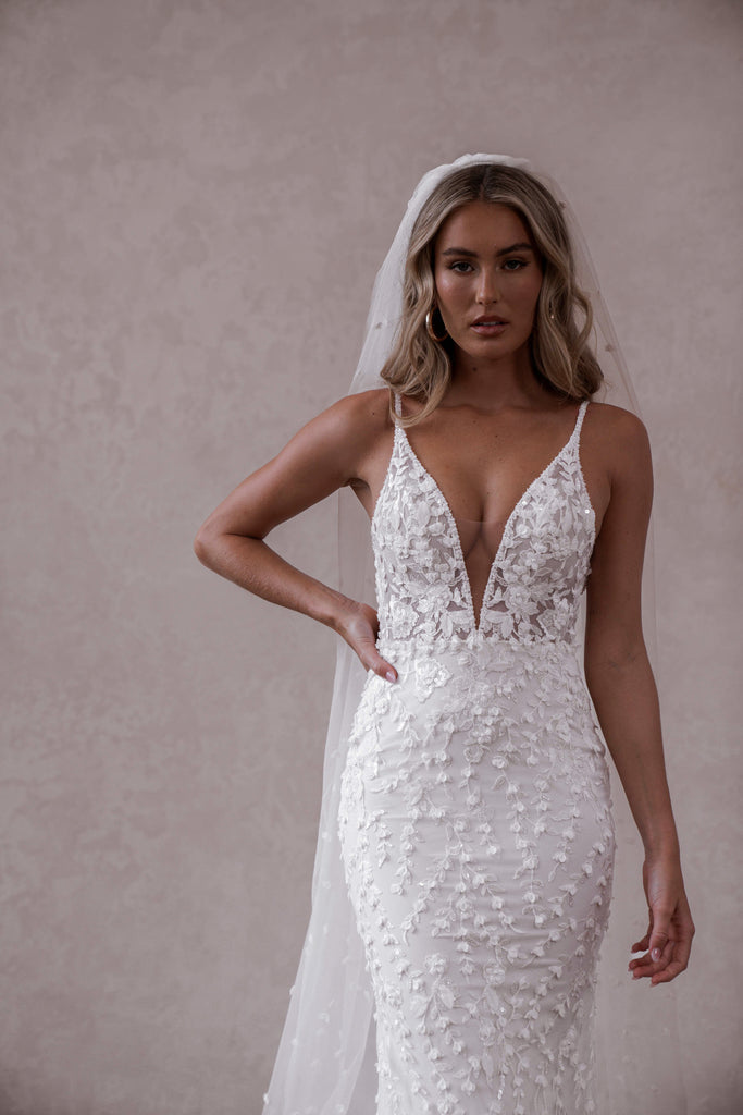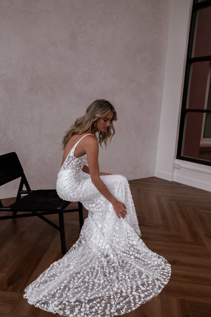 Elliot comes highly requested. She is made from our ever popular Posie lace and is the epitome of Made with Love. Her classic silhouette embodies all of our iconic design features; low plunging neckline, flattering fitted skirt and a deep V back. Elliot's sheer bodice and 3D, textured lace make her a timeless design that is perfect for the modern, romantic bride. Her low V back elongates the body and falls effortlessly into a sheer train. By Made With Love.