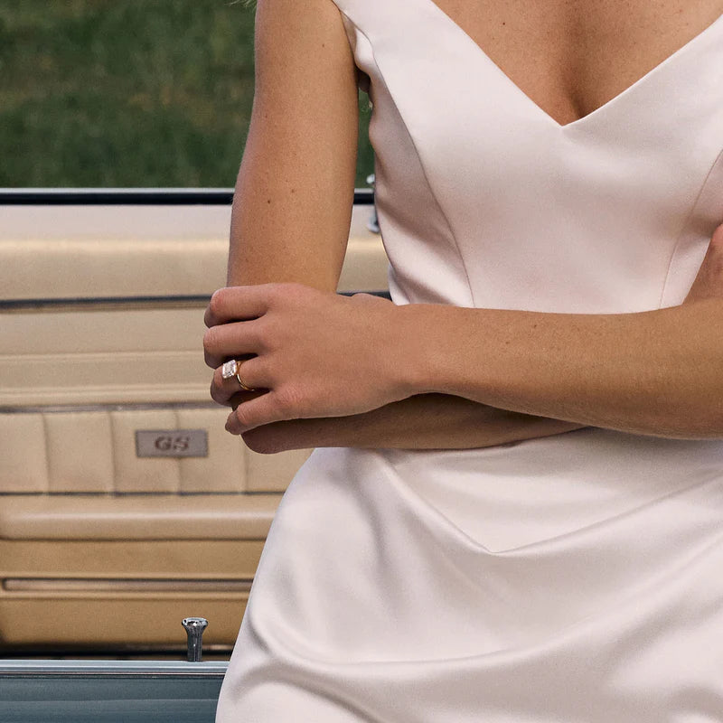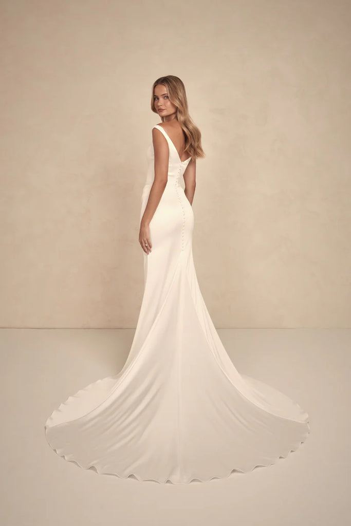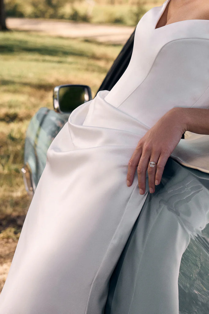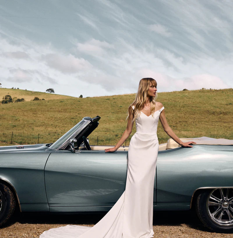 Isla is a love letter to the past, reimagined for the modern bride. Crafted in iconic luxurious lightweight satin, it features feminine off the shoulder sleeves that flatter and are undeniably romantic. The delicate rouche detail at the waist is artfully balanced to the side and creates a silhouette that feels both statuesque and unexpected. A long, elegant train pays homage to a whisper of old-world elegance