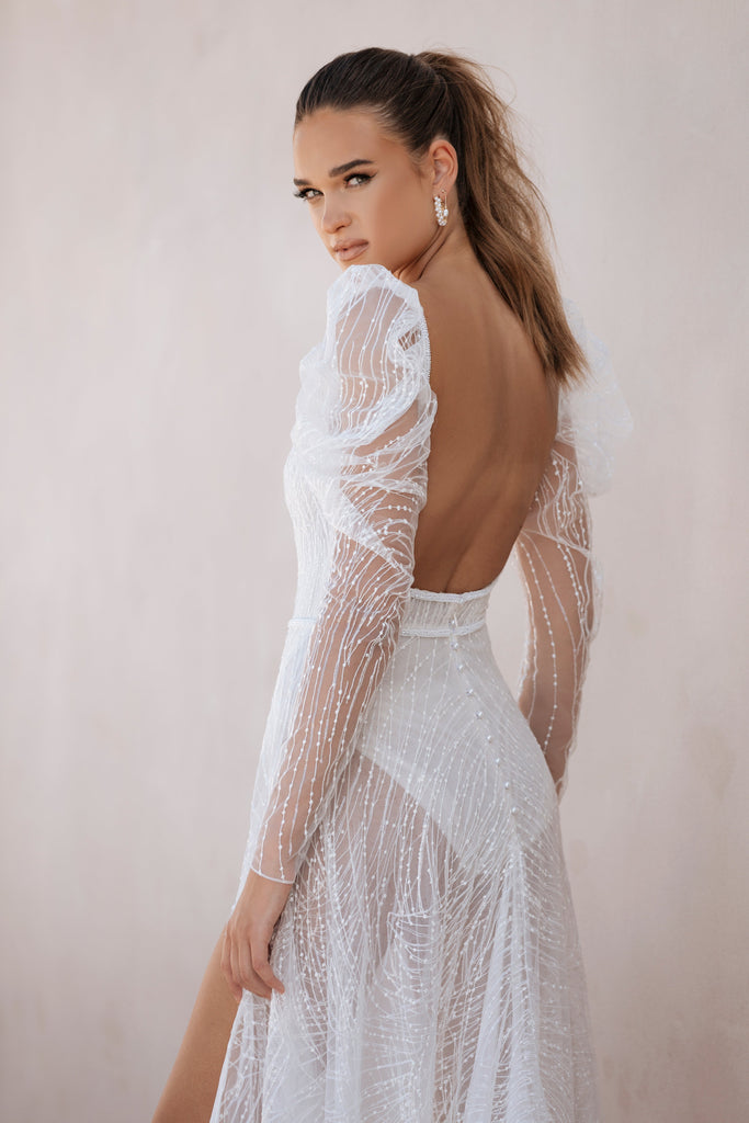 Most gowns can be sized down 2 sizes and may be able to be sized up. This bridal dress is a sample and may have minor wear from being tried on in our studio if not specified above. Please ensure you are happy with the condition before purchasing as all sales are final with no refunds, exchanges, or returns. We cannot hold any gowns for future purchase and full payment is required.
