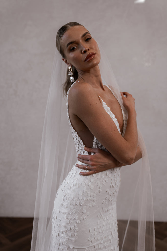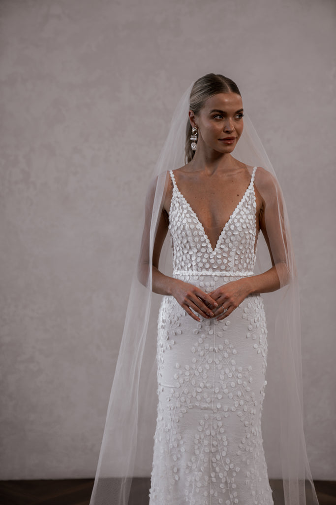 Most gowns can be sized down 2 sizes and may be able to be sized up. This bridal dress is a sample and may have minor wear from being tried on in our studio if not specified above. Dry cleaning may be recommended. Please ensure you are happy with the condition before purchasing as all sales are final with no refunds, exchanges, or returns. We cannot hold any gowns for future purchase and full payment is required.