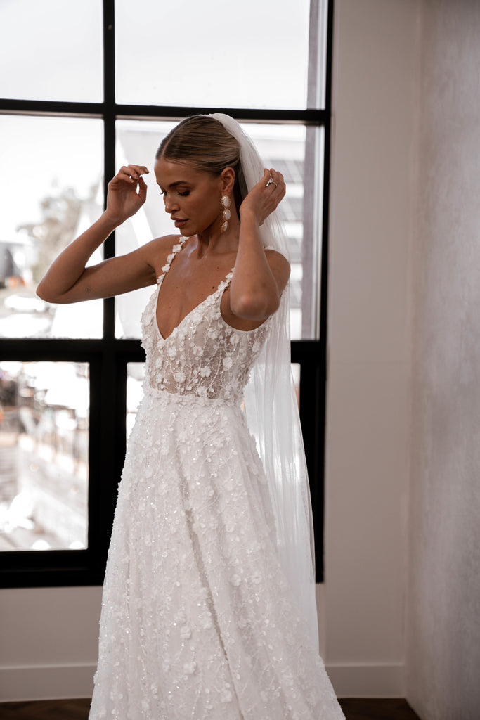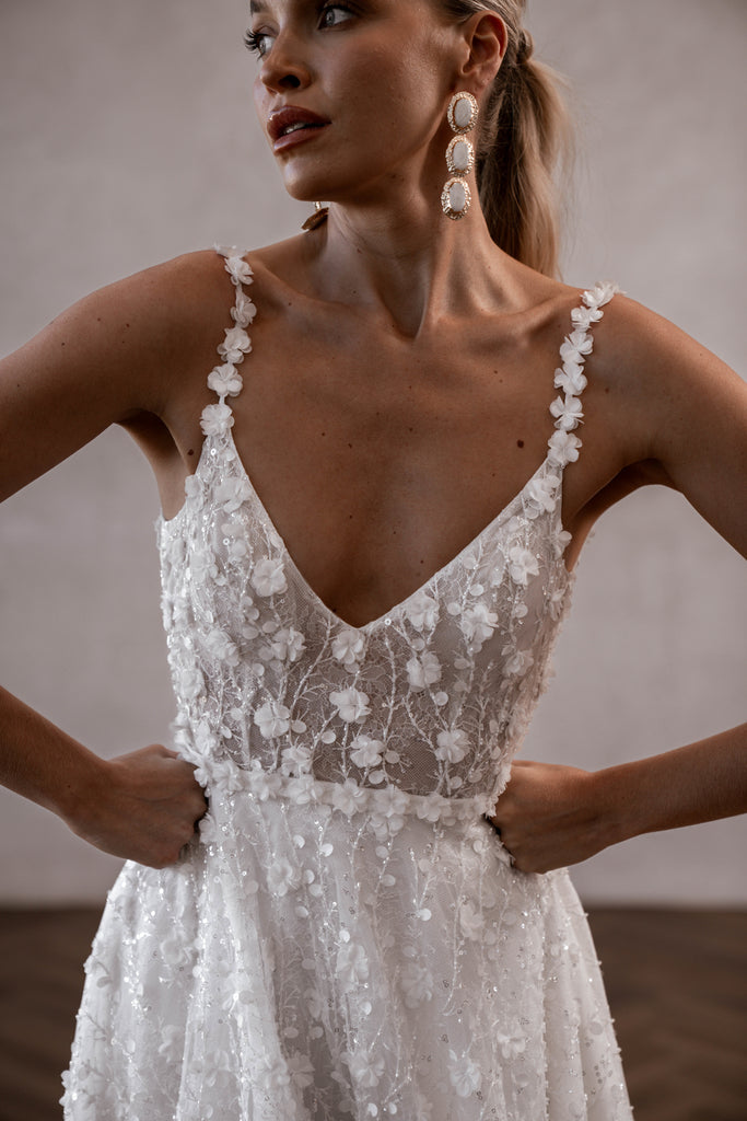 For those brides who can't get enough of Lenni's drop-dead gorgeous floral lace and after a full glamorous lace skirt, Lenni Flowy is the answer! Featuring Lenni's beloved subtle plunge neckline and soft, feminine petal straps, combined with our ever-popular full lace flowy skirt, Lenni Flowy feels like a sparkling dream to wear. By Made with Love.