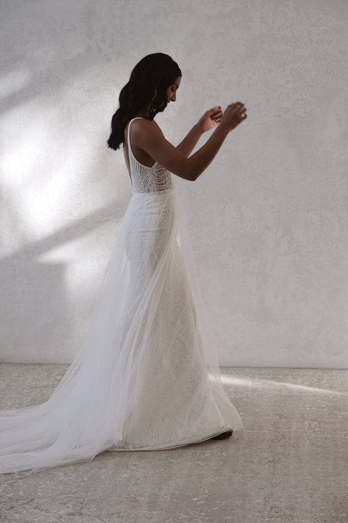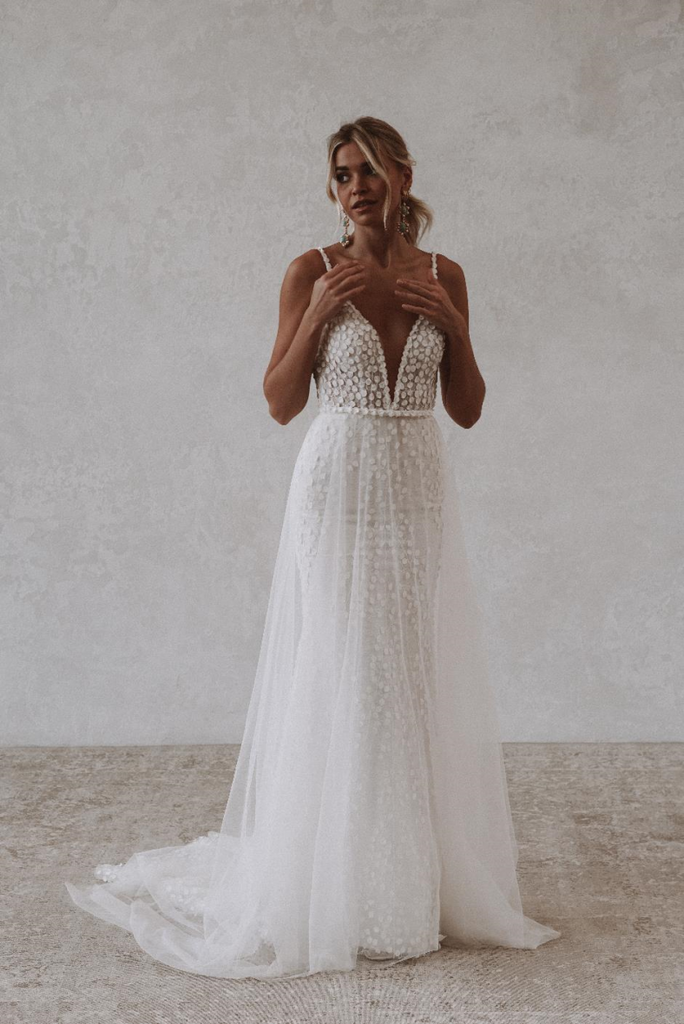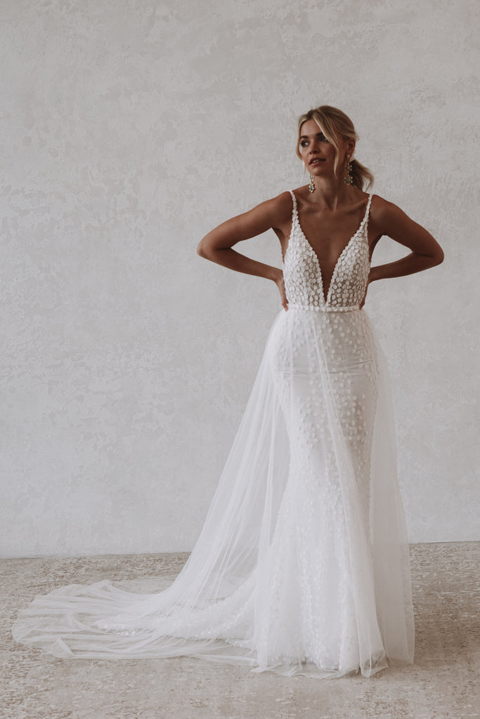 A single layer tulle skirt that looks perfect with all of our dresses. You get two looks on your wedding day! Traditional Ivory (off-white), single layer soft tulle, 1m long train and a very fine elastic invisible waistband. By Made with Love.